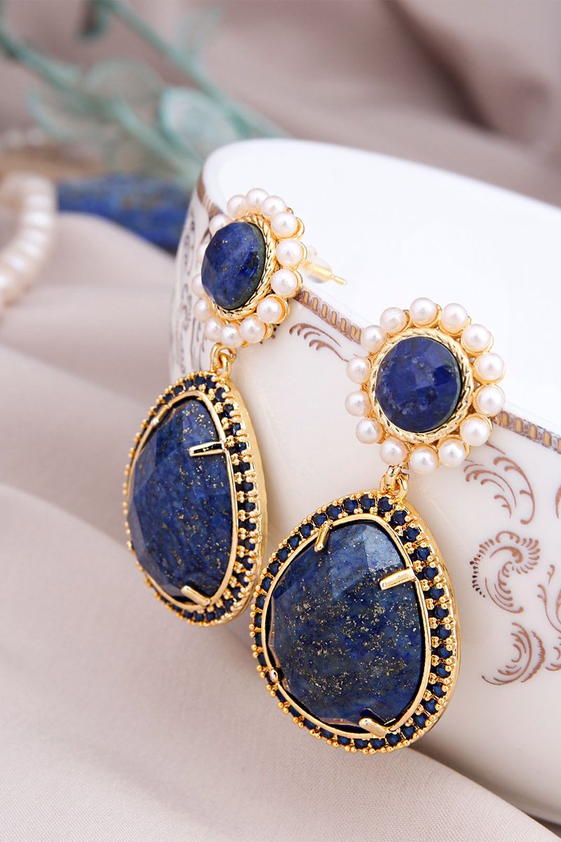 Brincos pendentes banhados a ouro amarelo com lápis-lazúli e pérolas de imitação.