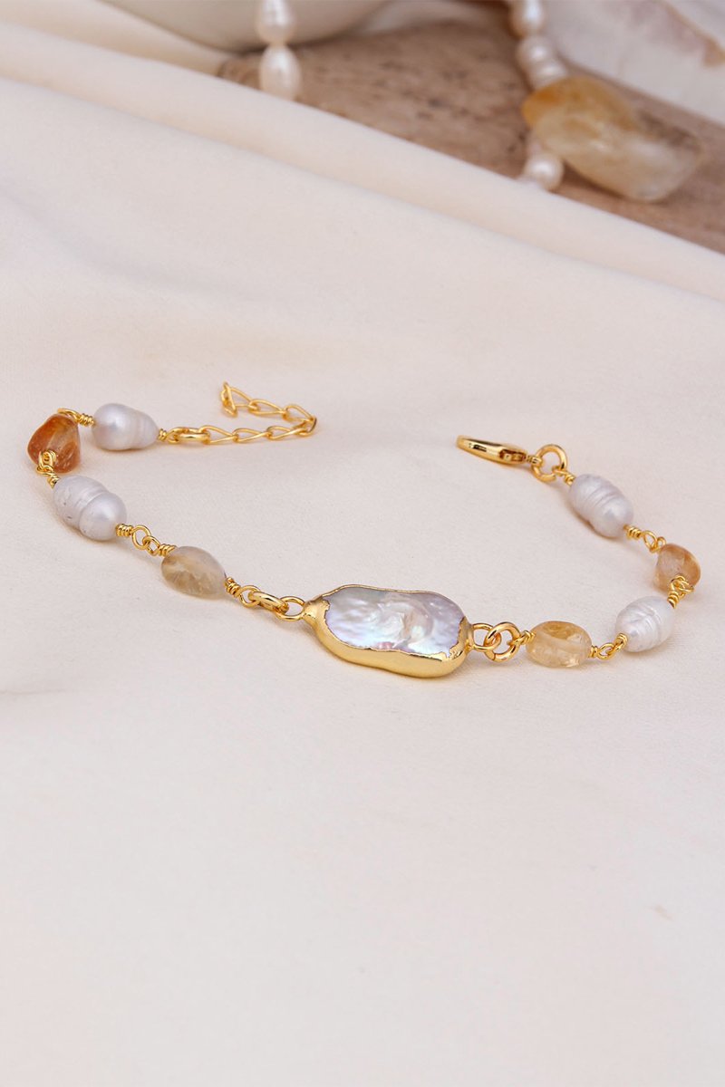 Pulseira folheada a ouro fino amarelo com citrinas e pérolas de imitação.