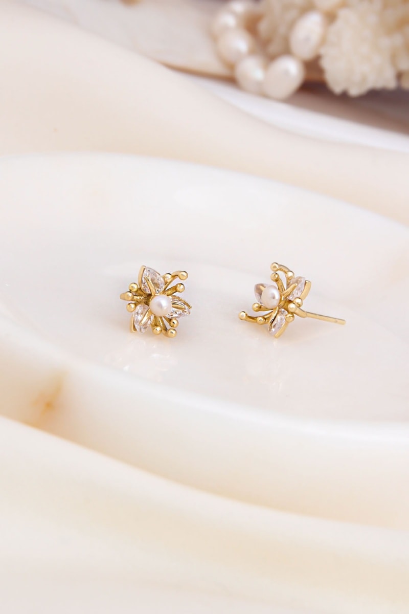Brincos banhados a ouro amarelo com uma pérola de cultura e cristais.