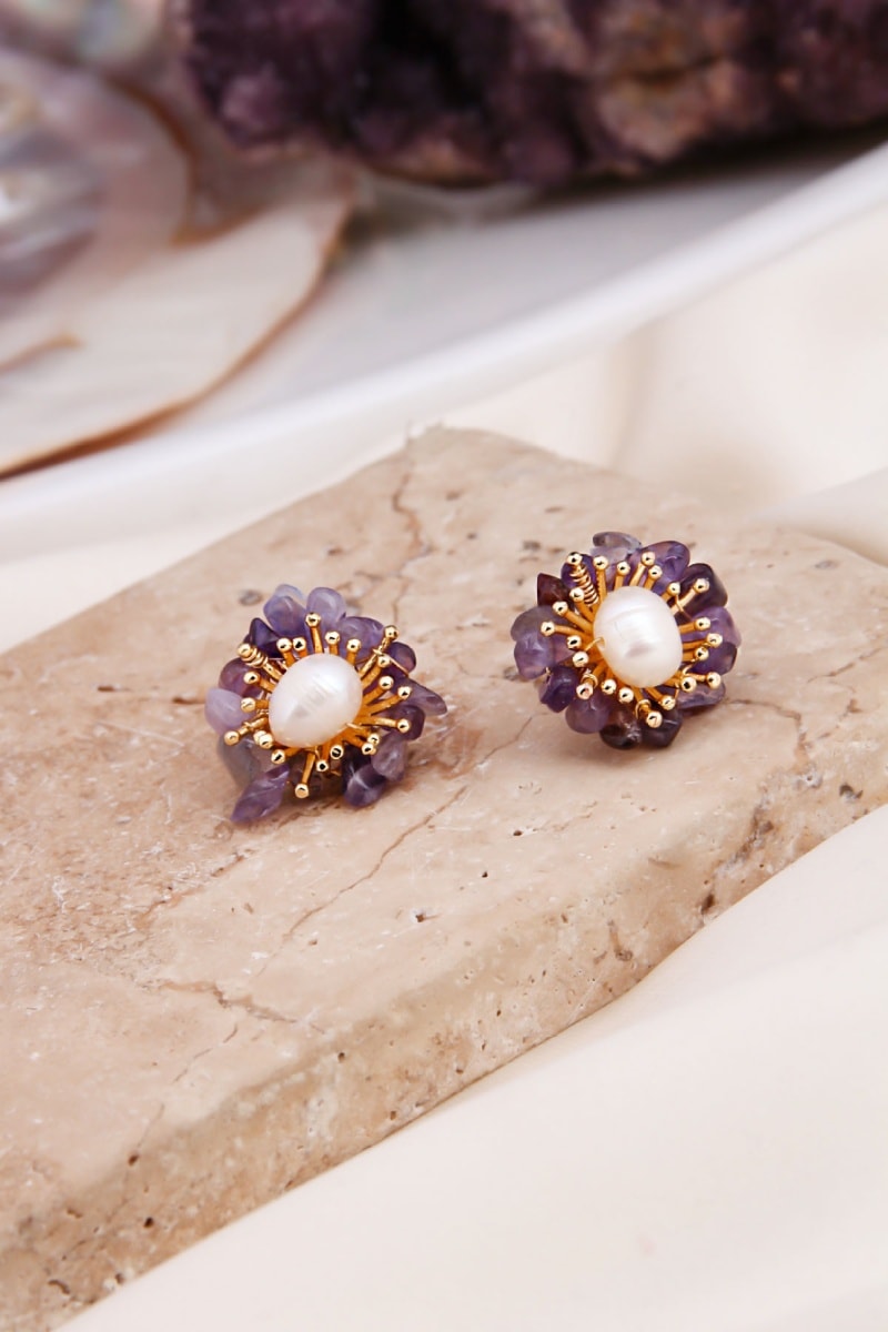 Brincos banhados a ouro amarelo com ametistas e uma pérola de cultura.