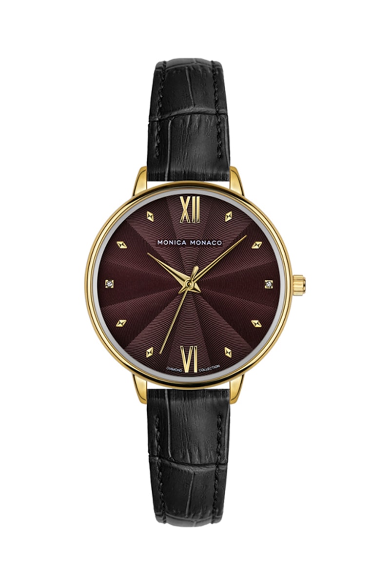 Relógio de quartzo em couro e diamantes - Preto e dourado - Monica Monaco
