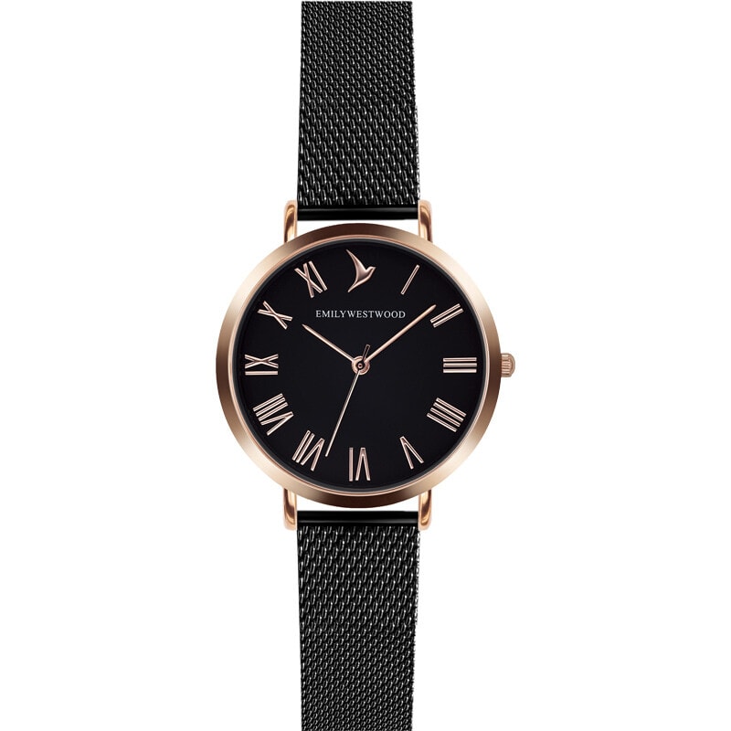 Relógio Nostalgy - Malha milanesa preta - Mostrador preto e rosa gold - 33 mm