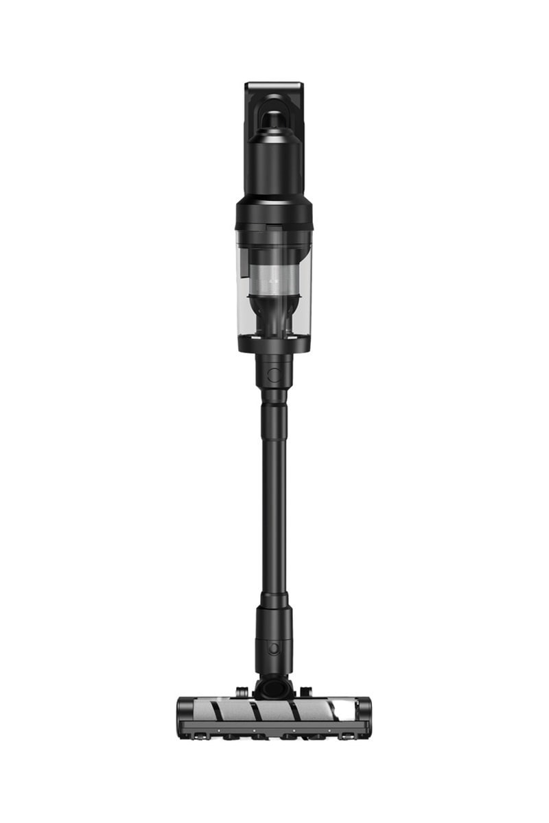 Aspirador vertical com saco e estação de carregamento e limpeza.