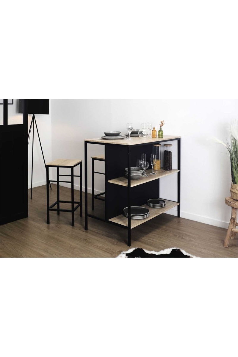 Mesa ilha e 2 bancos de bar Loka - Castanho e preto