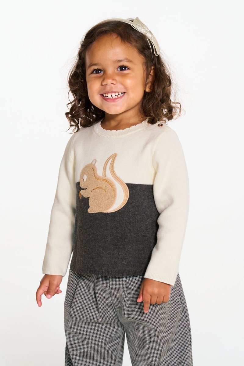 Padrão de esquilo bordado à frente.