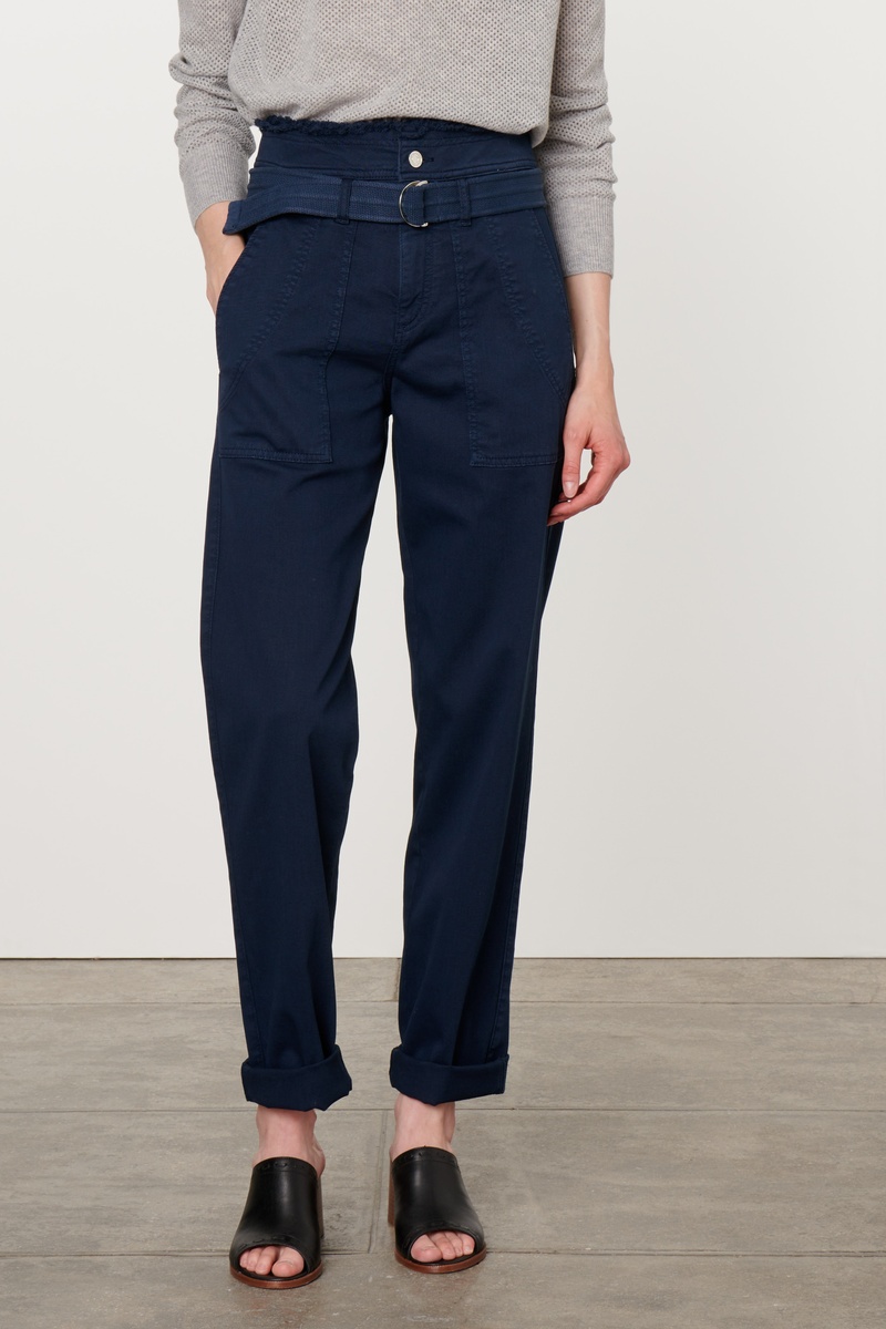 Cintura subida com atilhos de dupla fivela sob presilhas.