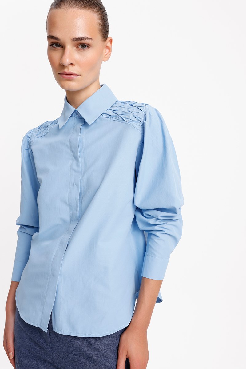 O modelo mede 1,79 m e veste o artigo no tamanho 36.