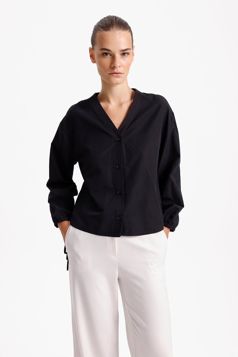 Camisa de mangas compridas com atilhos de ajuste.