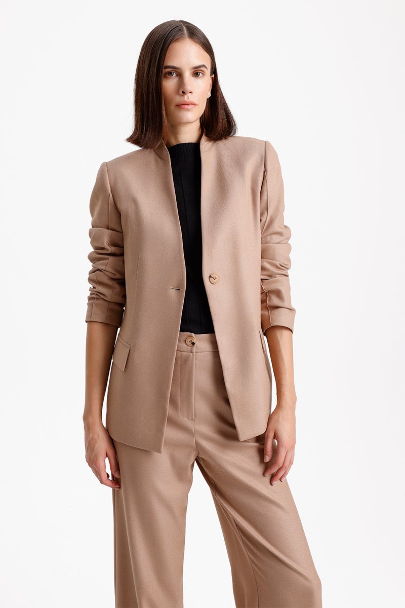 O modelo mede 1,79 m e veste o artigo no tamanho 36.