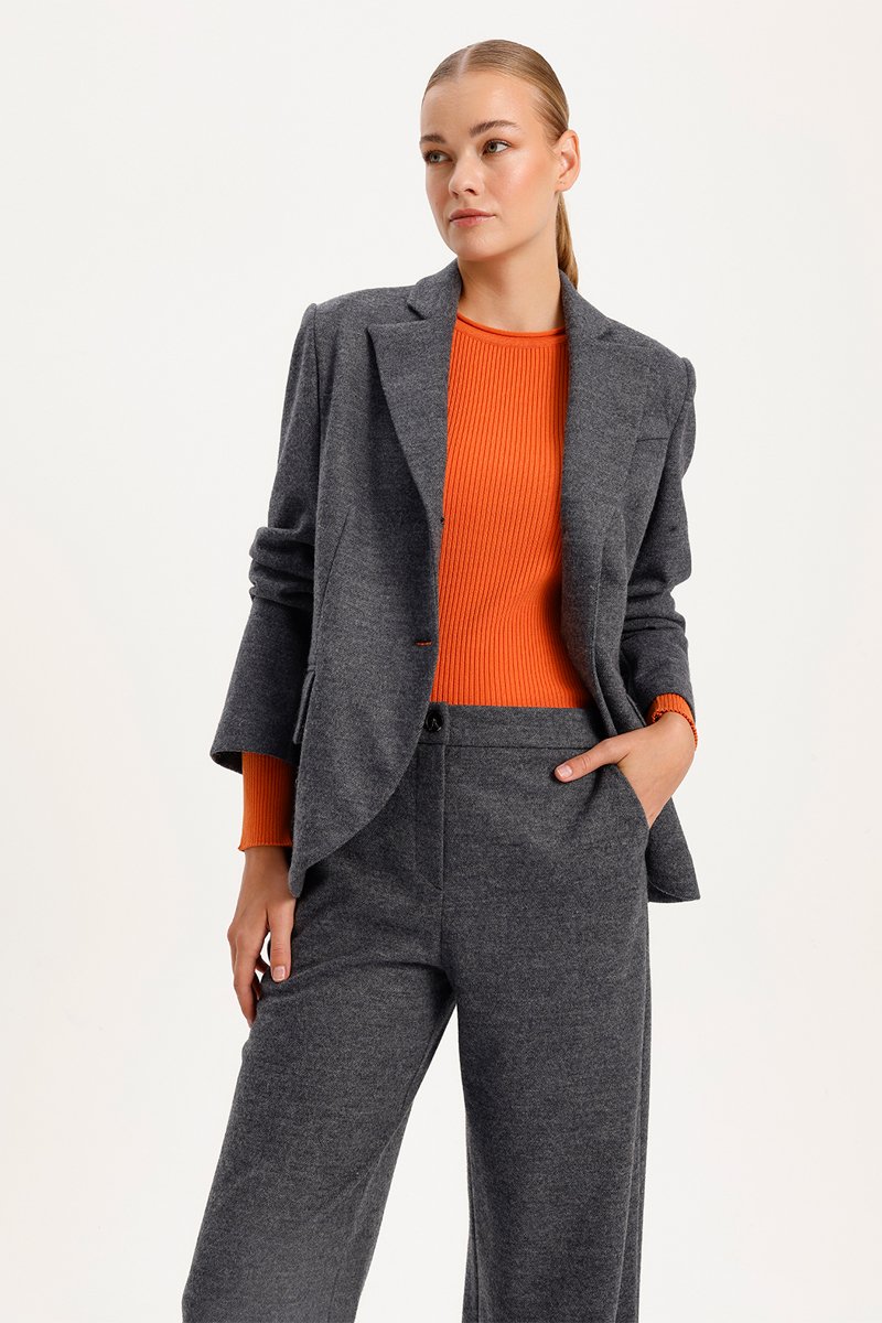 O modelo mede 1,79 m e veste o artigo no tamanho 38.