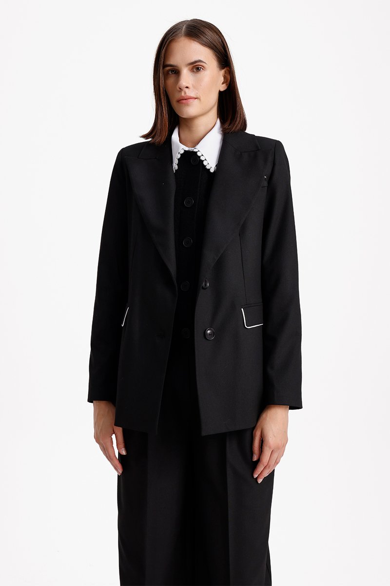 O modelo mede 1,79 m e veste o artigo no tamanho 36.