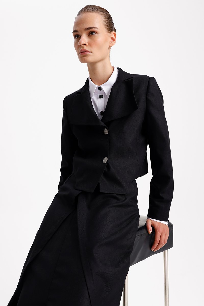 O modelo mede 1,79 m e veste o artigo no tamanho 36.
