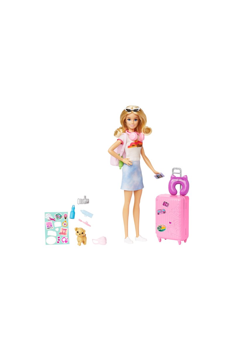 A boneca Barbie® “Malibu” Roberts está pronta para partir para seu próximo destino com seu cachorrinho e mais de 10 acessórios de viagem. As crianças podem usar a folha de adesivos incluída para decorar sua mala, que abre e fecha para ainda mais realismo.