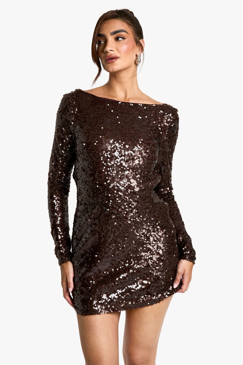 Vestido estilo patinadora com lantejoulas de mangas compridas.