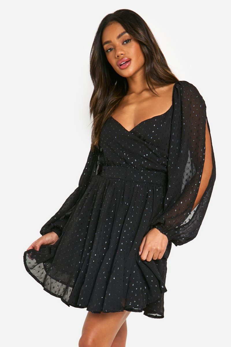 Vestido estilo patinadora de mangas compridas com abertura.