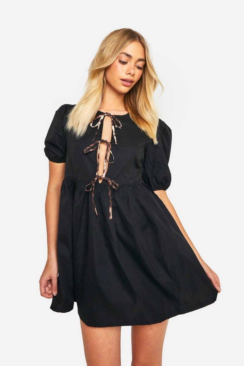 Recorte e atilhos de atar com estampado leopardo à frente.