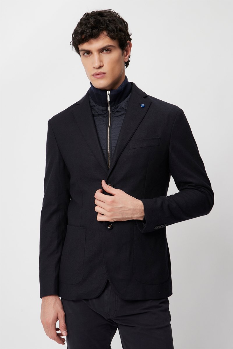 Composição: 46% poliéster, 40% lã, 12% viscose e 2% elastano