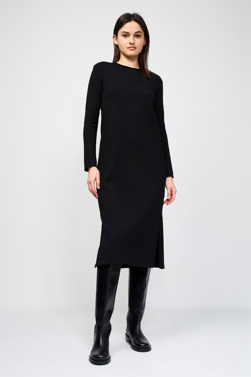 Vestido comprido em lã virgem misturada de mangas compridas.