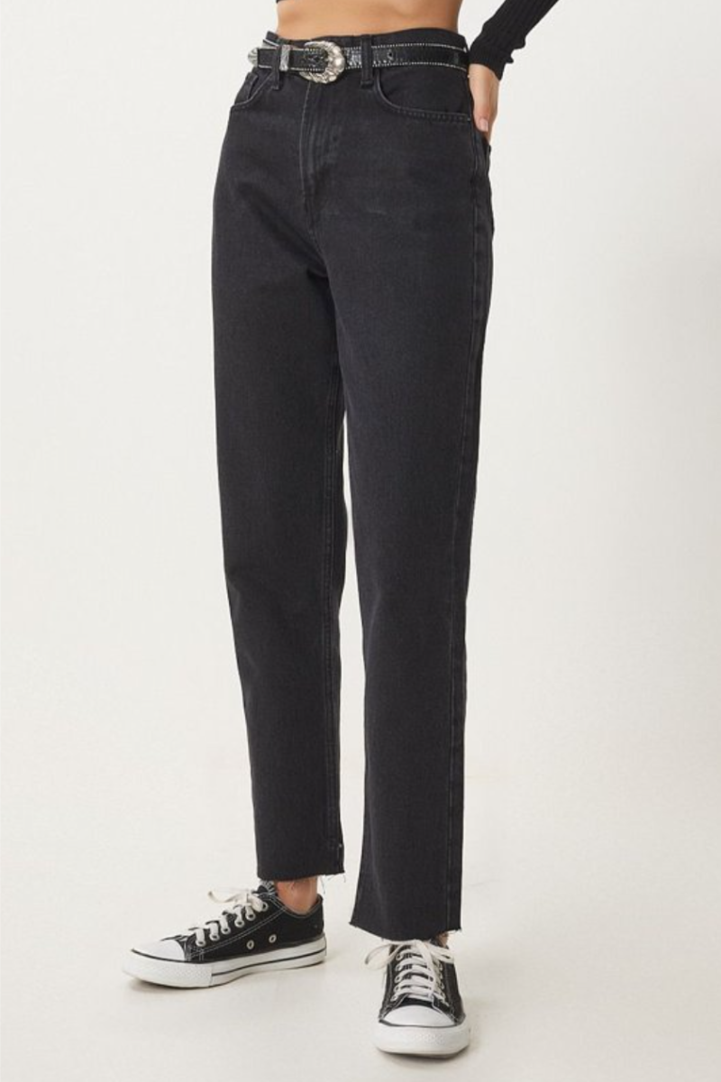 Calças de ganga direitas de cintura alta - Preto