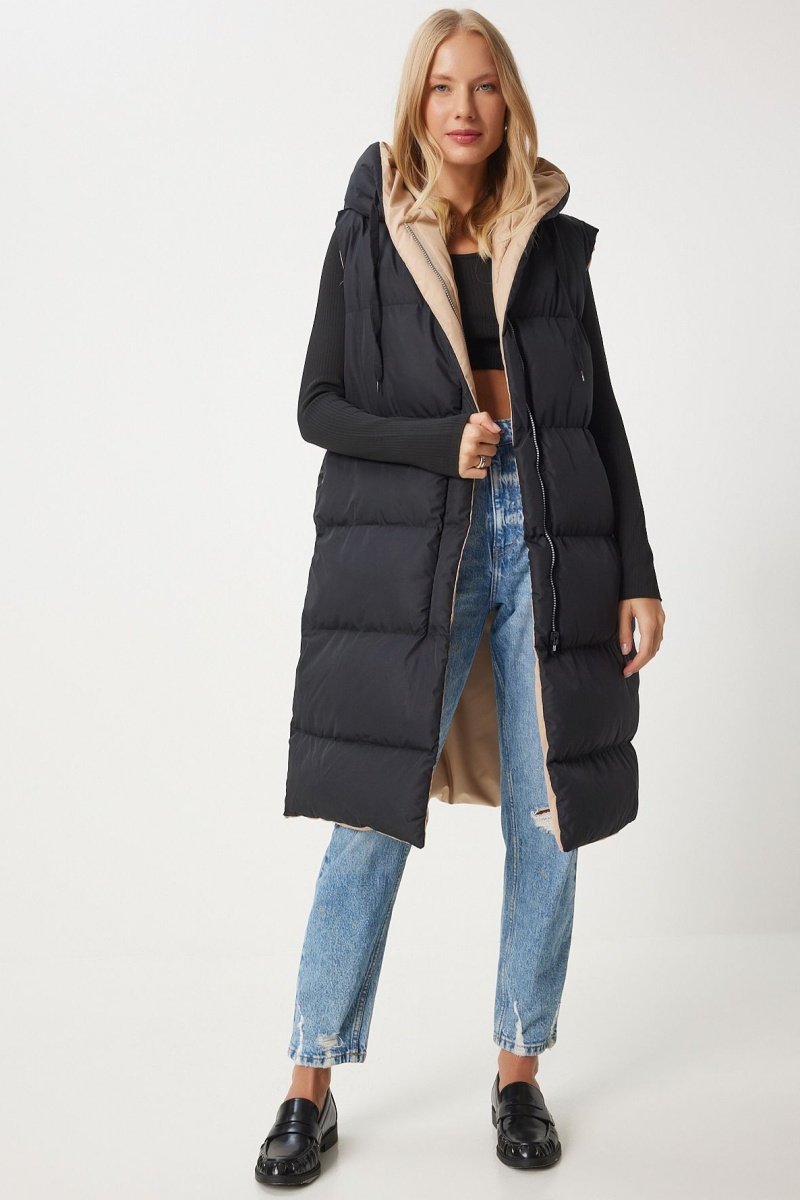 Colete acolchoado reversível - Preto e bege