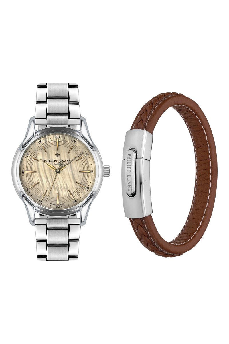 Coffret relógio de quartzo em aço e bracelete em couro