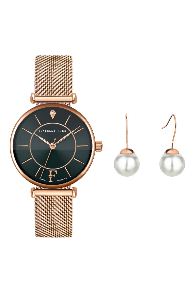 Coffret relógio de quartzo em aço, diamante e brincos e pérolas finas Portia
