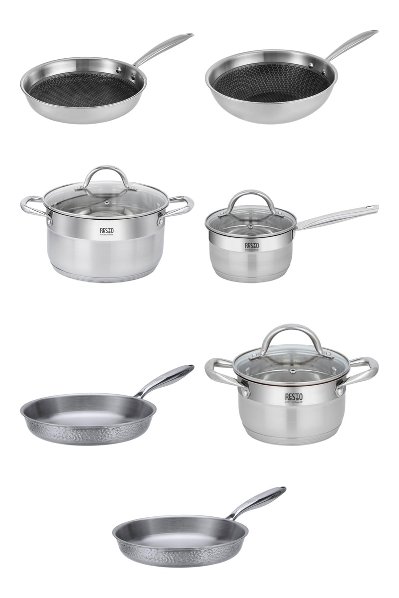 3 frigideiras, 2 panelas, 1 caçarola e 1 wok em aço inoxidável - 30, 26, 24, 24, 16, 16 e 28 cm