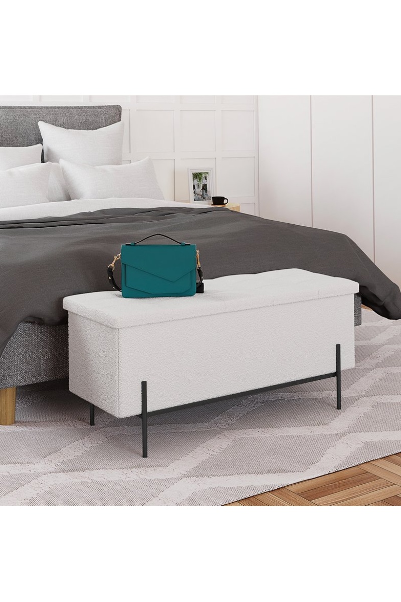 Composição: tecido de poliéster bouclettes, metal e MDF