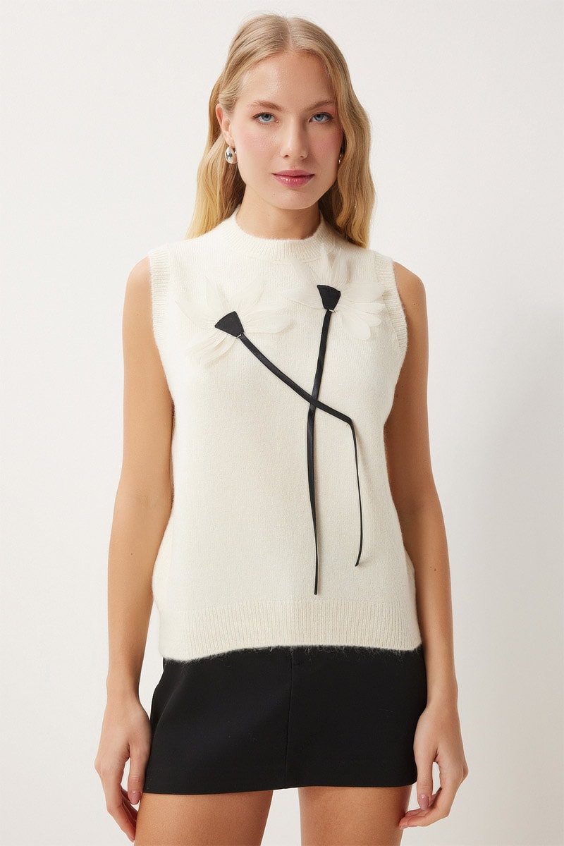 Aplicação forma de flor e atilhos de atar à frente.