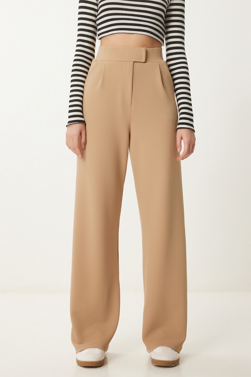 Calças wide legs cintura alta - Bege