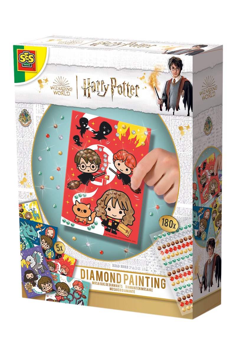 Incentiva as capacidades motoras finas e a criatividade ao criar belas obras de arte com diamantes com o tema Harry Potter.
