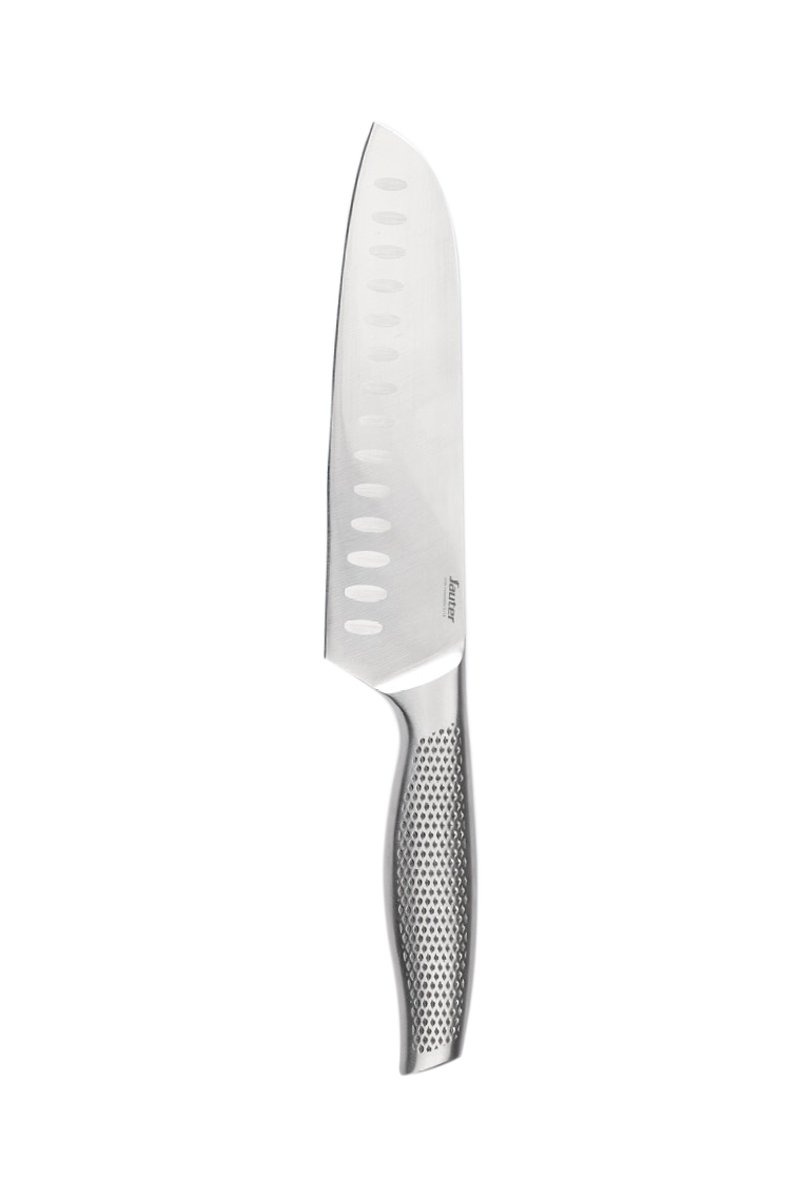 Faca polivalente com uma lâmina alveolar que permite evitar aos alimentos de colarem.