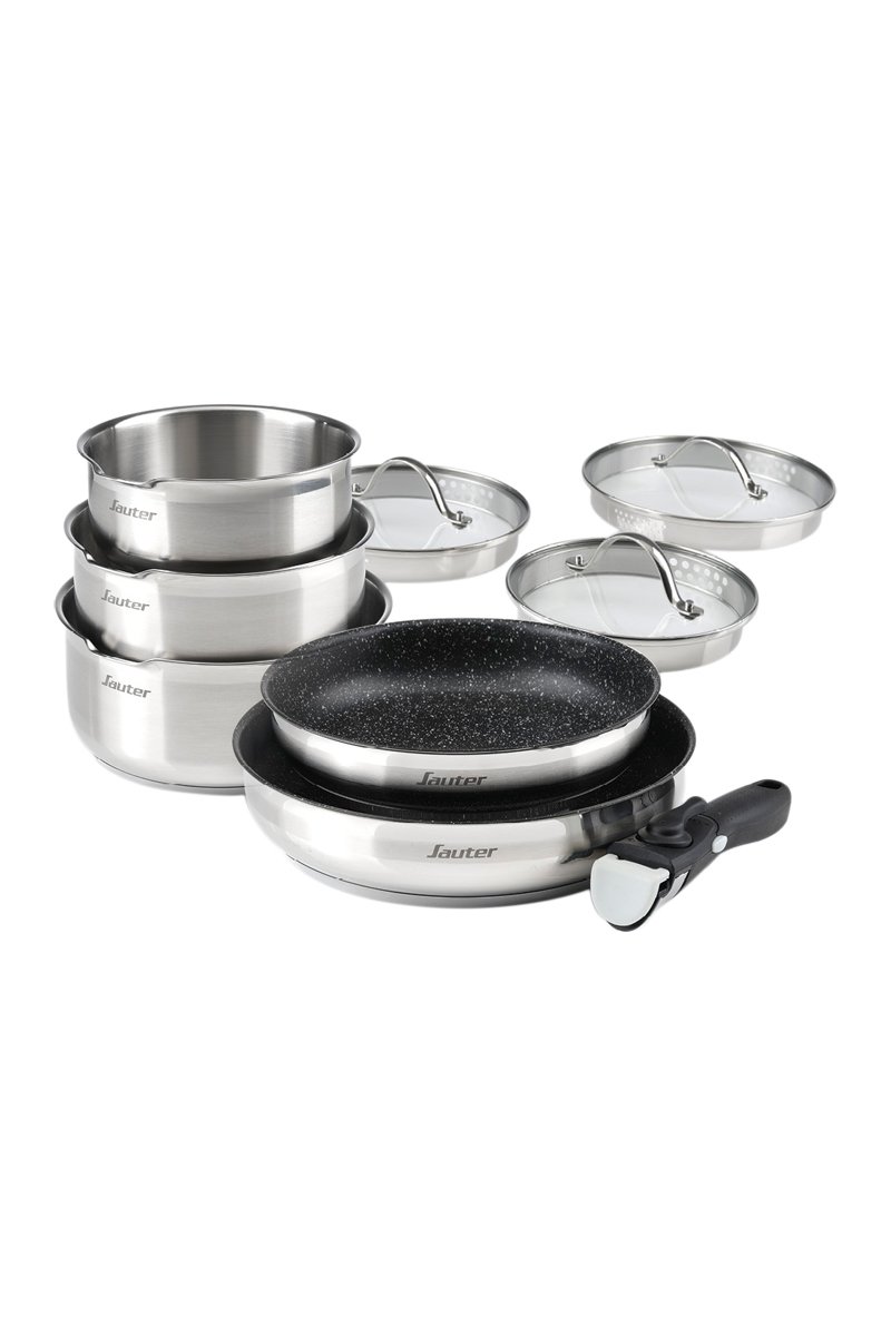 Frigideiras e panelas muito fáceis de arrumar com o seu design encaixável que ocupa pouco espaço e o cabo amovível.