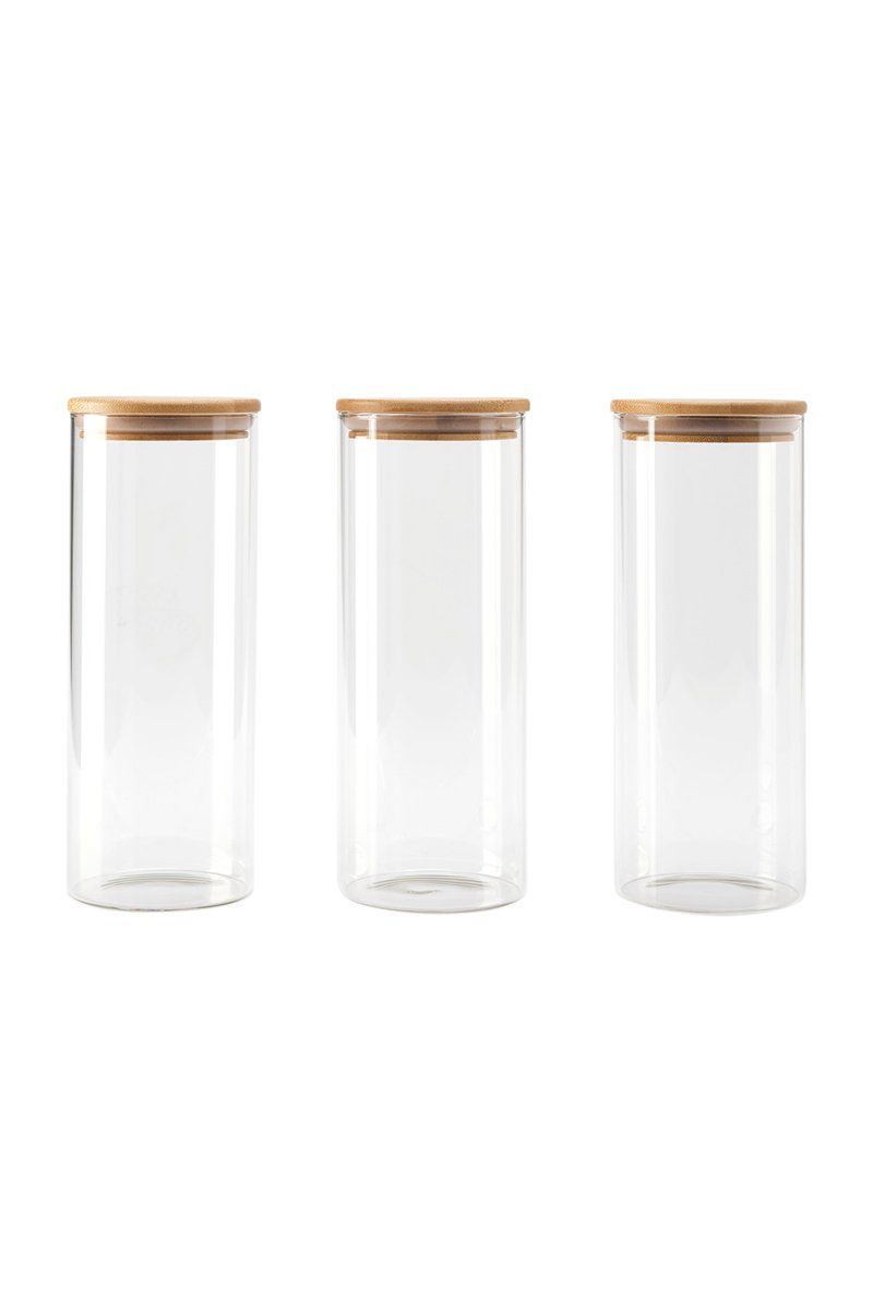 3 frascos em vidro borossilicato com tampas em bambu.