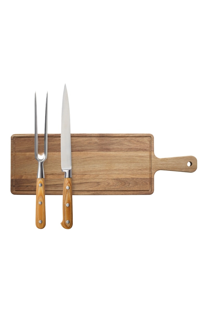 Tábua de madeira e 2 utensílios de aço inoxidável
