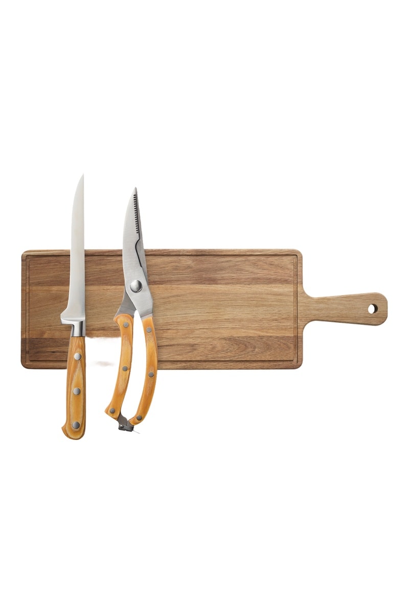 Tábua de madeira e 2 utensílios de aço inoxidável