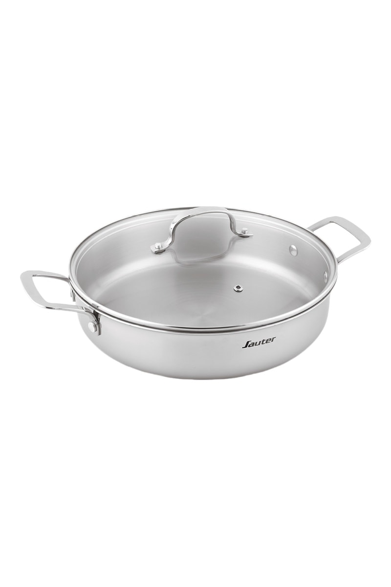 Frigideira em aço inoxidável e tampa de vidro com válvula anti-embacio.