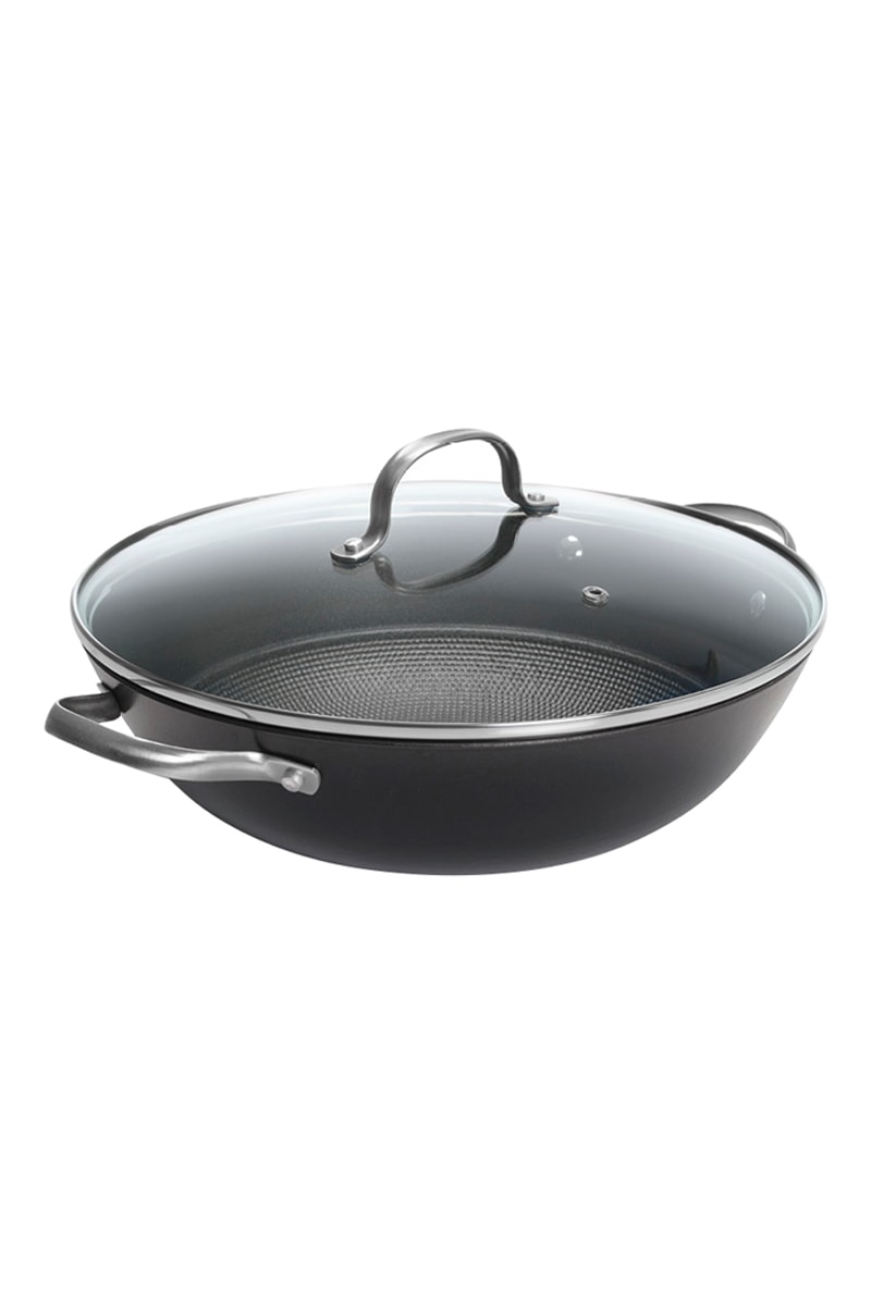 Wok em aço inoxidável e tampa de vidro com válvula anti-embacio.