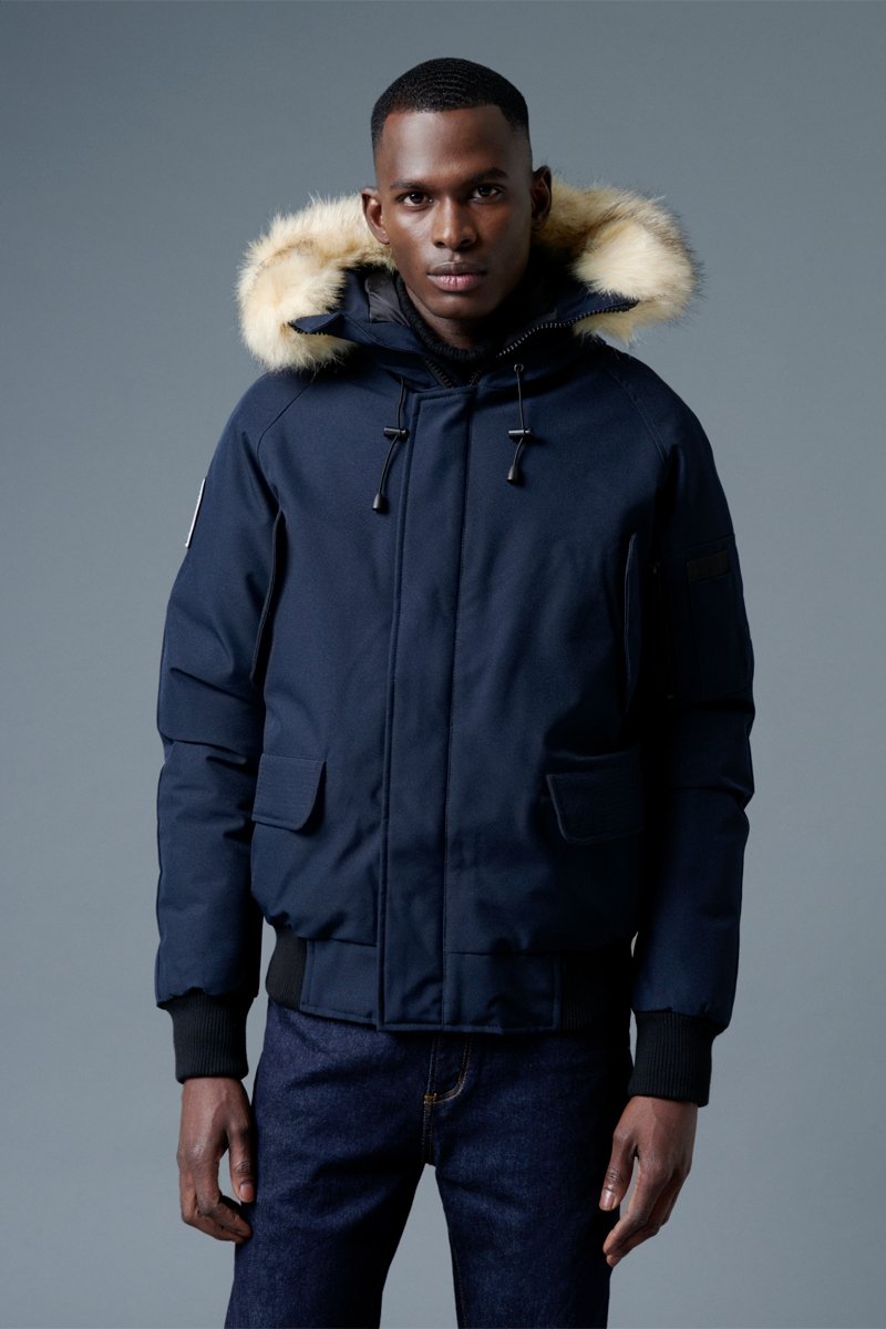 Capuz com pelo sintético amovível e atilhos de ajuste.