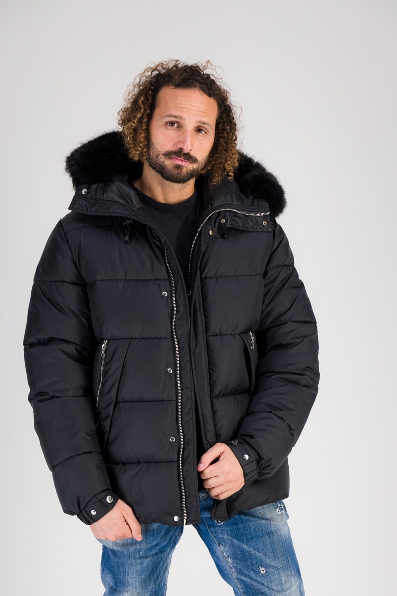 Capuz fixo e ajustável com atilhos de ajuste e pelo sintético amovível.