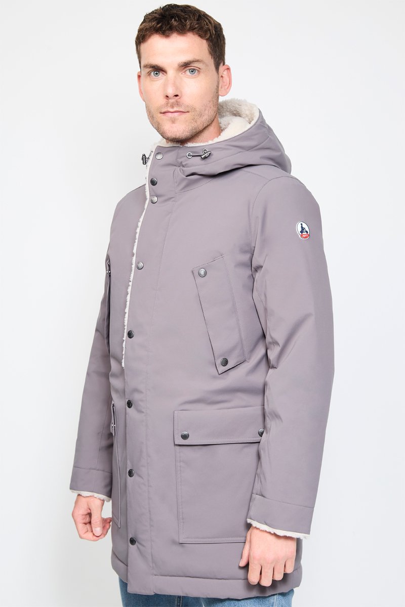 Parca com capuz com atilhos de ajuste e travões de cordão.