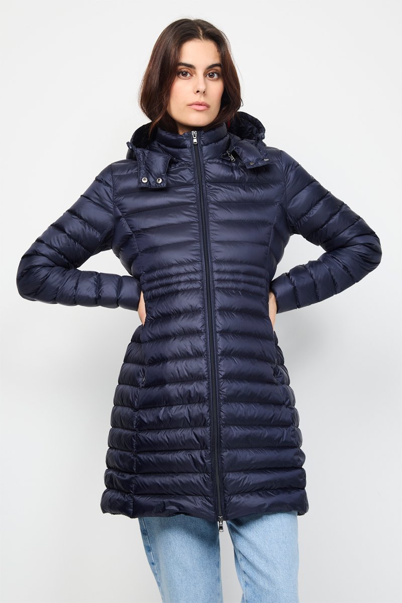 Capuz amovível com atilho de ajuste, trava-cordão e tira pressionável.