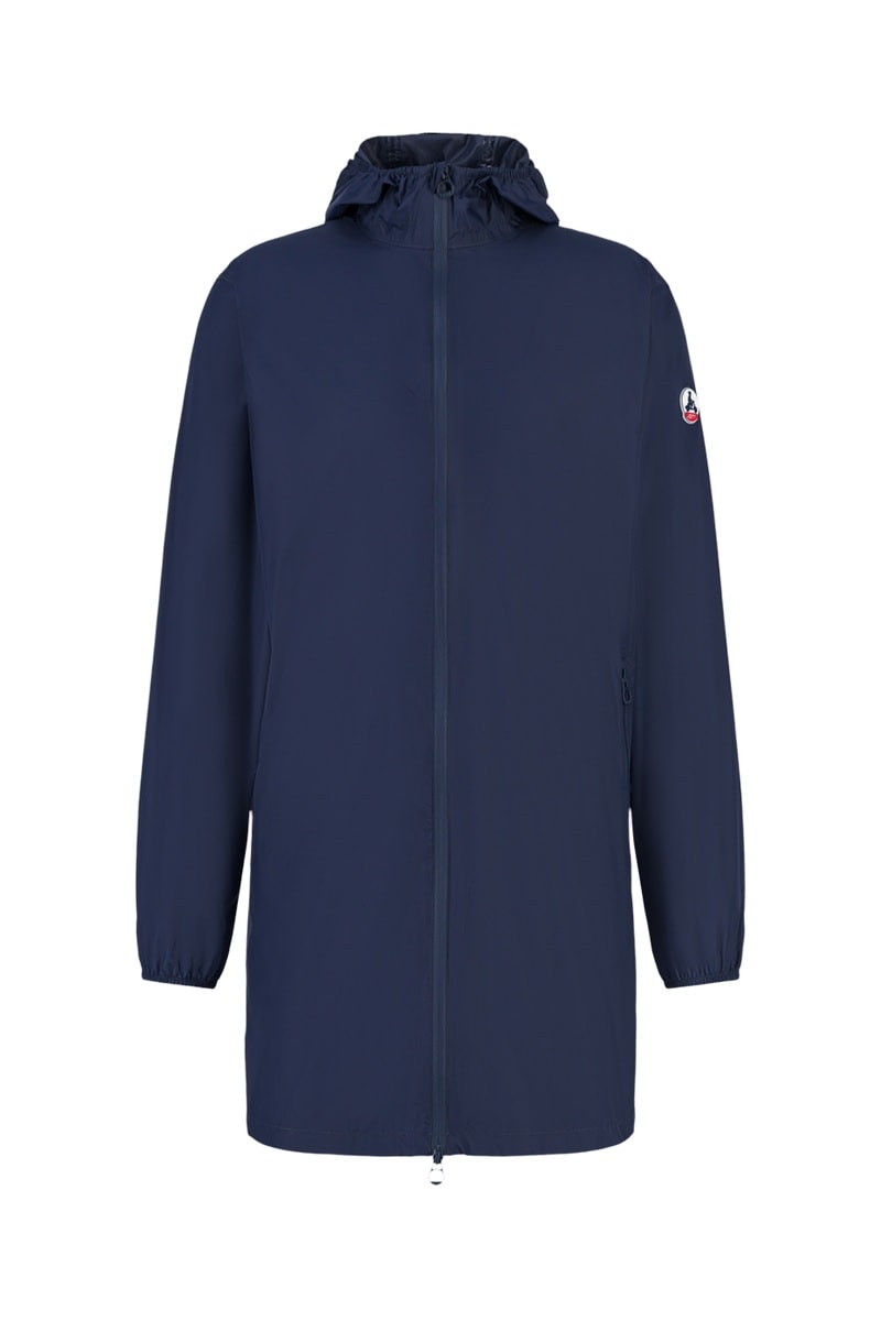 Impermeável com capuz e atilhos de ajuste de mangas compridas.