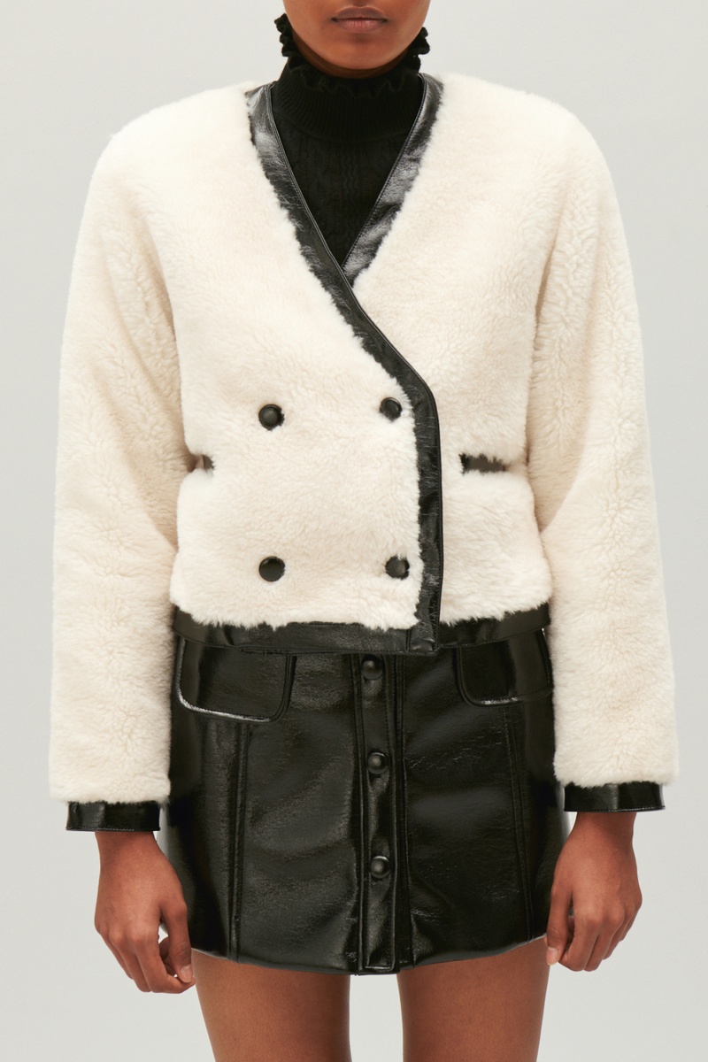 Aplicações efeito couro no decote, nas mangas, à frente e na base.