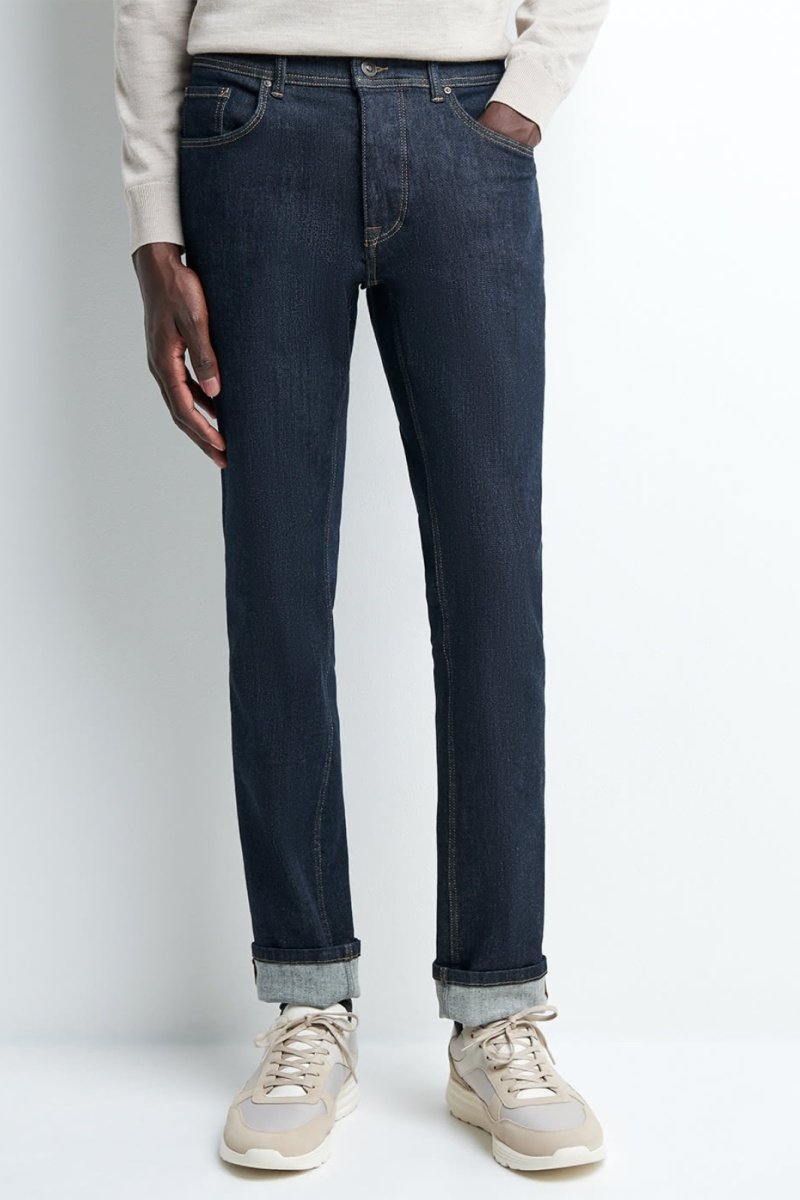 Descubra as nossas calças de ganga extra-finas com um padrão liso, fabricadas em algodão e poliéster reciclados para uma combinação perfeita de conforto e durabilidade.