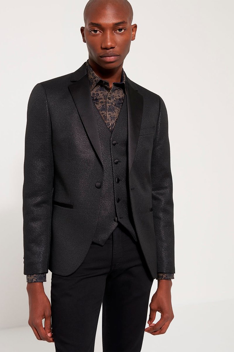 O modelo mede 1 m 84 e veste o artigo no tamanho 50.