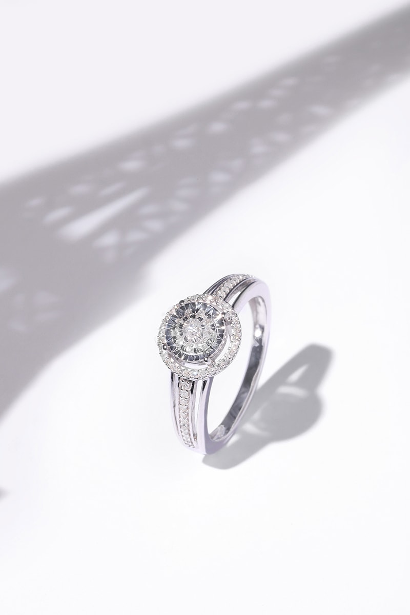 Anel solitário de ouro branco com 61 diamantes.