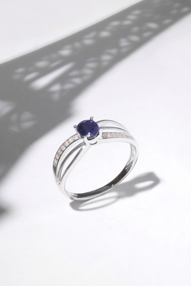 Anel René - Ouro branco, diamantes e safira