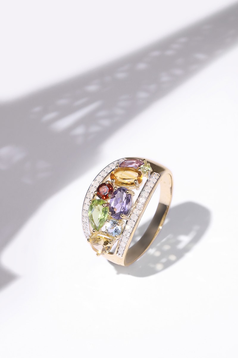 Anel de ouro amarelo com 32 diamantes, 2 ametistas, 2 citrinas, 2 peridotos, uma granada e um topázio.