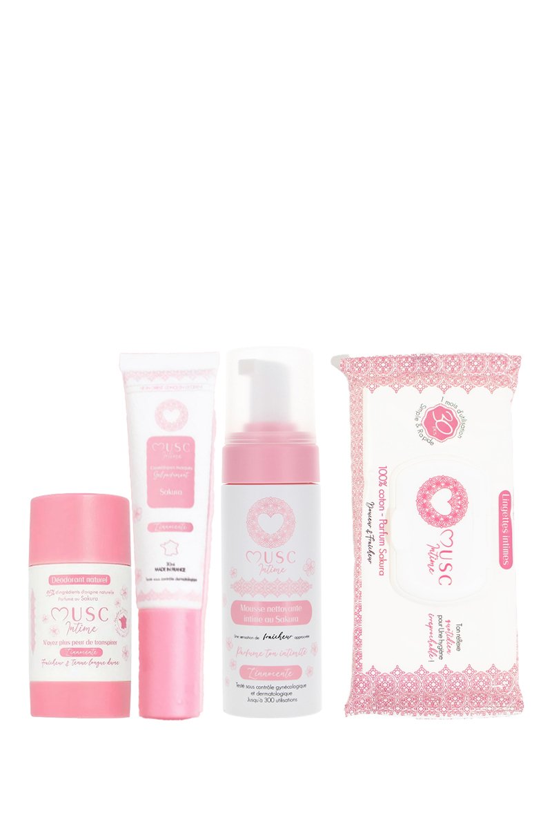 Desodorizante natural de Sakura L'Innocente - 50 g, Gel íntimo perfumado Sakura L'Innocente - 30 ml, Toalhetes íntimos Fleur de Sakura - 30 toalhetes e Espuma de limpeza íntima com Sakura L'innocente - 150 ml